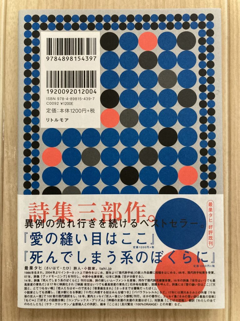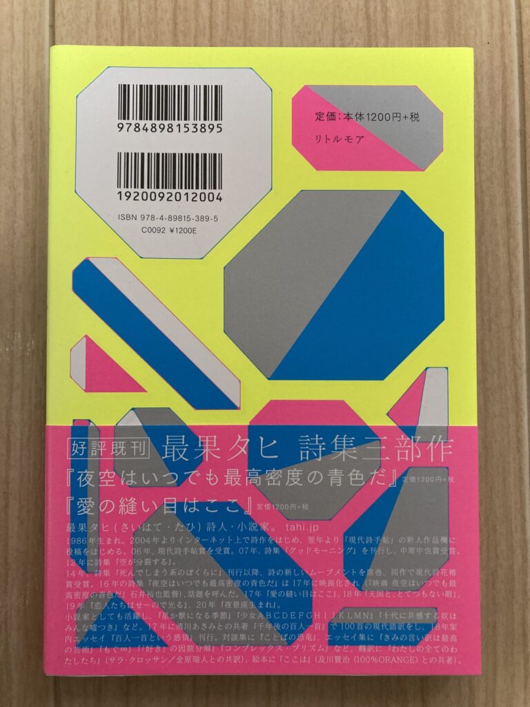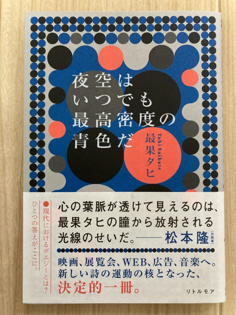 ・「夜空はいつでも最高密度の青色だ」 最果タヒ著 リトルモア 定価1320円 (詩集)
